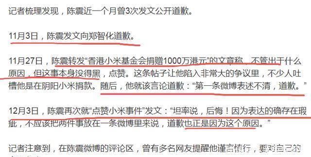 据统计,陈震仅近期一个月内就公开道歉3次:11月3日的“郑智化事件”、11月27日的“小米捐款事件”,以及12月3日就小米相关争议再次致歉。