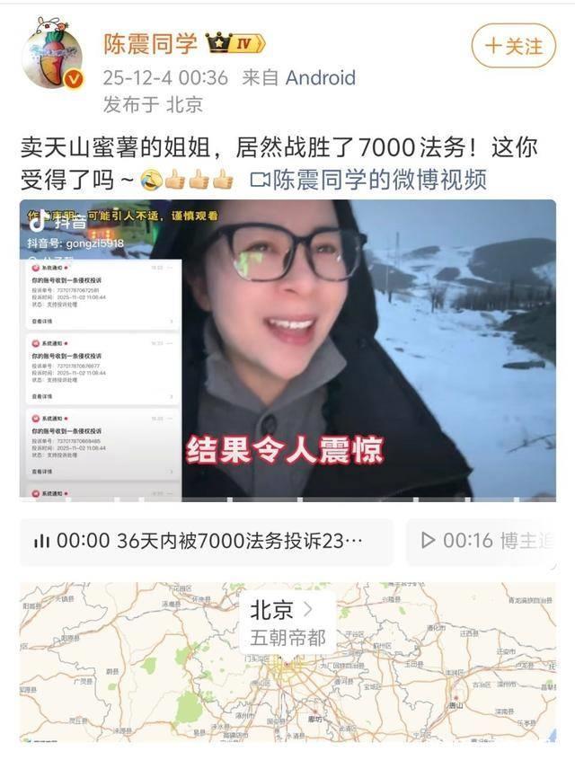 比如此前,一位天山卖蜜薯的女生因被某公司法务投诉引发关注,后续凭自身努力克服困难,可到了陈震嘴里,却阴阳怪气地调侃她“战胜了7000法务”。