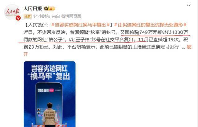 但违法违规者终究逃不过监管,他的复出账号很快被再次封禁了。人民日报更是专门点名批评这个“劣迹网红”,明确表示明令禁止其复出,因为屡次触碰法律红线的人,本就不值得任何同情。